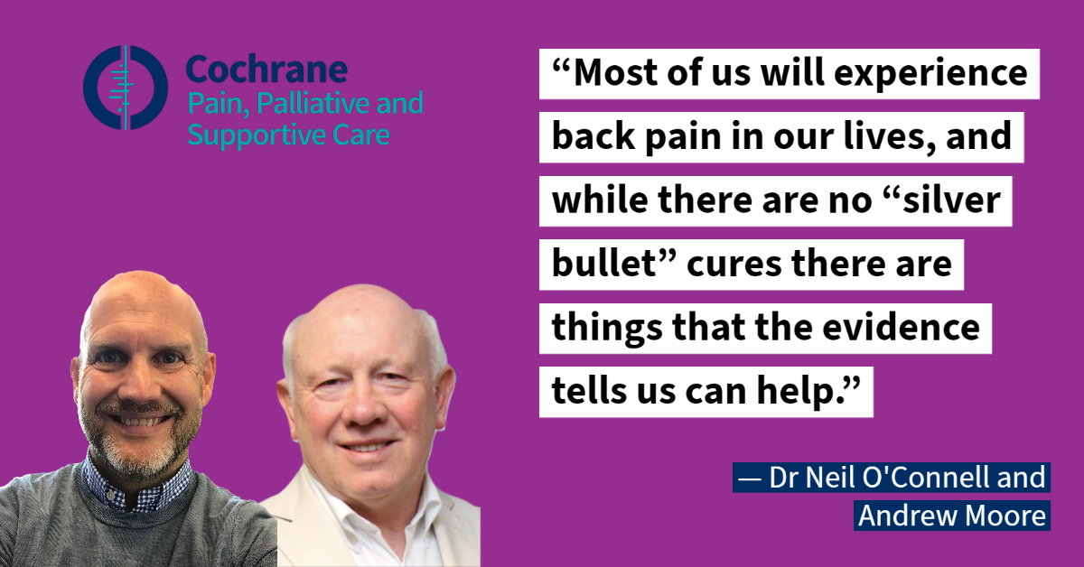 Back pain is a common problem for many and a major cause of disability across the world. It is expensive in terms of healthcare costs and lost working hours. To help make sure people try interventions with high quality evidence Prof. Andrew Moore and Dr Neil O'Connell from Cochrane PaPaS discussed the evidence around back pain treatment with Which?, a not-for-profit 'consumer champion' organization.