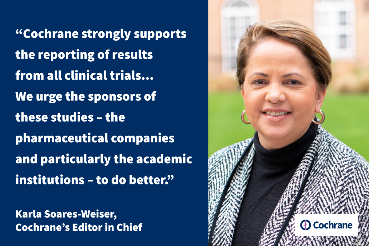 Karla Soares-Weiser, Cochrane’s Editor in Chief, responded to the EC-EMA-HMA letter, saying: “Cochrane strongly supports the reporting of results from all clinical trials. Failure to report findings and the selective sharing of results stop us from getting a full view of the evidence for our systematic reviews – so the benefits of an intervention could be exaggerated, or the harms underestimated. This severely undermines the ability to make truly evidence-informed decisions about healthcare.