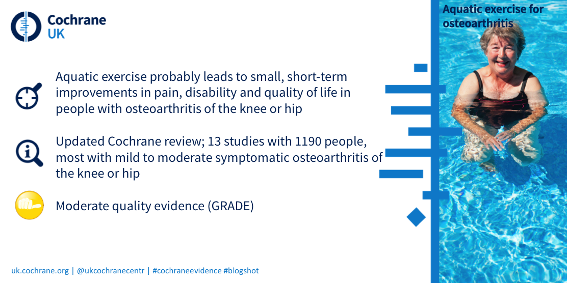 A team of Cochrane authors based in Denmark and Norway worked with Cochrane Musculoskeletal to investigate the effects of aquatic exercise for people with knee or hip osteoarthritis, or both. The Cochrane Review includes 13 trials with a total of 1190 participants. The authors rated the evidence to be of moderate quality. Most participants were female, with an average age of 68 years. Osteoarthritis duration was 6.7 years, with a great variation of the included participants.