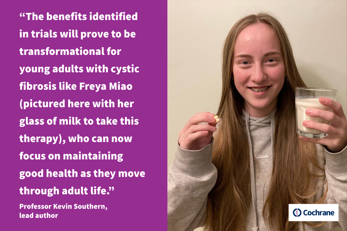 Professor Kevin Southern, lead author of this review, has been involved in the care of children with CF for over 30 years, and has a deep appreciation of the impact of this condition on the young people and their families. "It has been great to work with the team to produce this comprehensive review, which clearly identifies the positive impact that triple therapy has on the well being of people with CF. The benefits identified in trials will prove to be transformational for young adults with CF like Freya Miao (pictured here with her glass of milk to take this therapy), who can now focus on maintaining good health as they move through adult life."