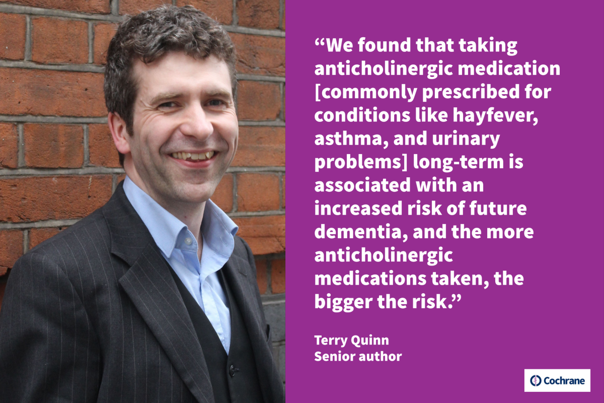 In this review we collated all the published evidence around anticholinergic prescribing and future risk of dementia. We found that taking anticholinergic medication long-term is associated with an increased risk of future dementia, and the more anticholinergic medications taken, the bigger the risk.