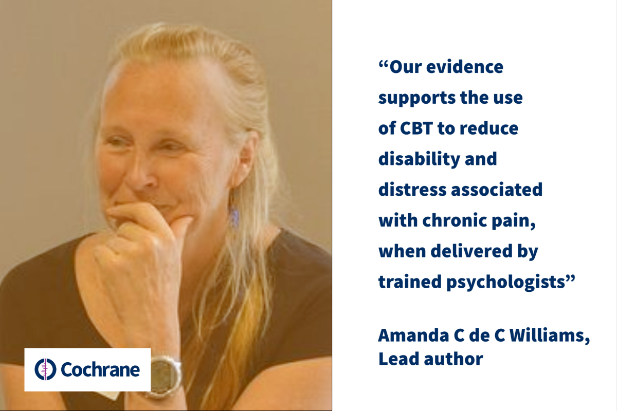 Many people experience pain that lasts more than three months that is neither cancer‐related nor a headache. The search for a diagnosis and pain relief is often long and can be discouraging.  In this interview, lead author of the recently updated Cochrane Review Psychological therapies for the management of chronic pain (excluding headache) in adults Amanda C de C Williams discusses the findings of this review.