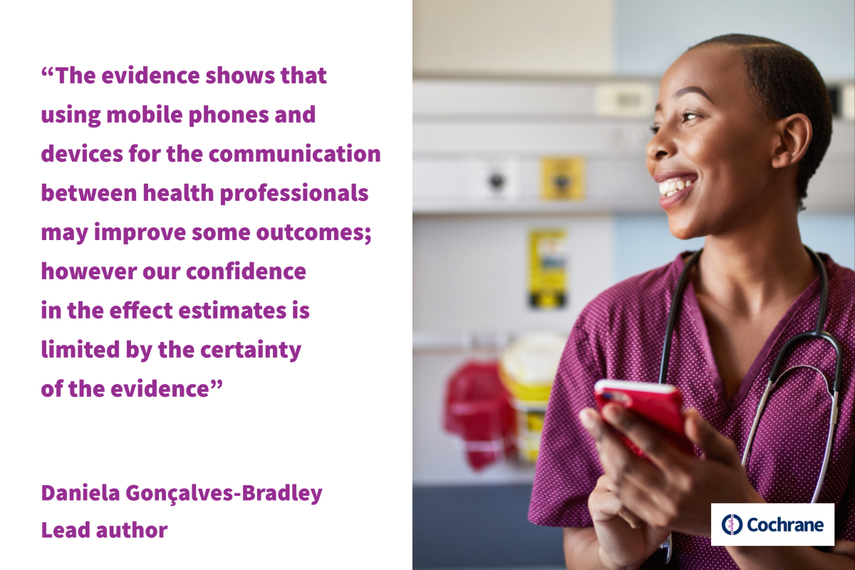 Daniela Gonçalves-Bradley, lead author of the review says, “This review looks at the evidence for three different healthcare scenarios; primary healthcare workers consulting with hospital specialists, emergency doctors consulting with hospital specialists, and community health workers or home‐care workers consulting with clinic staff. The evidence shows that using mobile phones and devices for the communication between health professionals may improve some outcomes; however our confidence in the effect estimates is limited by the certainty of the evidence. As this is a growing area of work, we hope that there will be more robust studies in a future update that will address data‐sharing and privacy concerns and identify common core outcomes.”