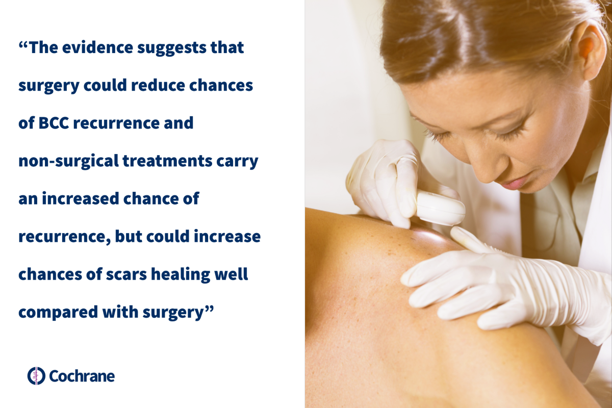 - non‐surgical treatments such as anti‐cancer creams or photodynamic therapy carry an increased chance of BCC recurrence, but could increase chances of scars healing well compared with surgery.