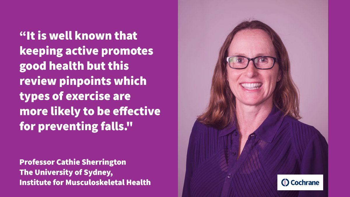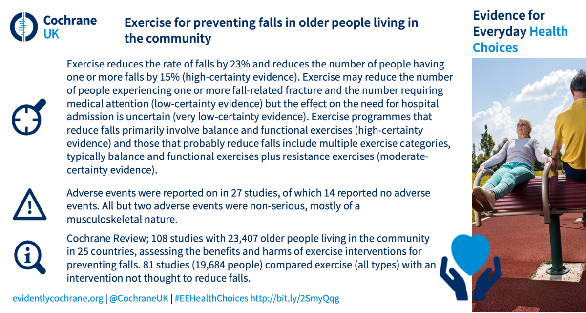 Full Citation: Sherrington C, Fairhall NJ, Wallbank GK, Tiedemann A, Michaleff ZA, Howard K, Clemson L, Hopewell S, Lamb SE. Exercise for preventing falls in older people living in the community. Cochrane Database of Systematic Reviews 2019 , Issue 1 . Art. No.: CD012424. DOI: 10.1002/14651858.CD012424.pub2
