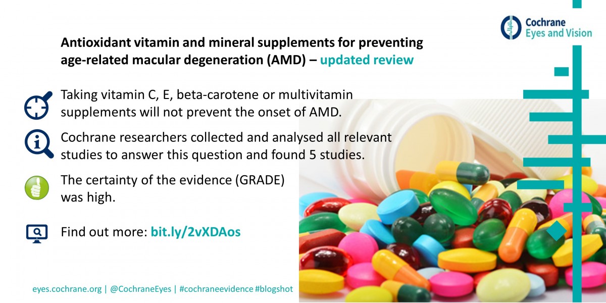 A team of Cochrane researchers conducted a study to assess whether taking antioxidant vitamin and mineral supplements prevents the development of AMD.