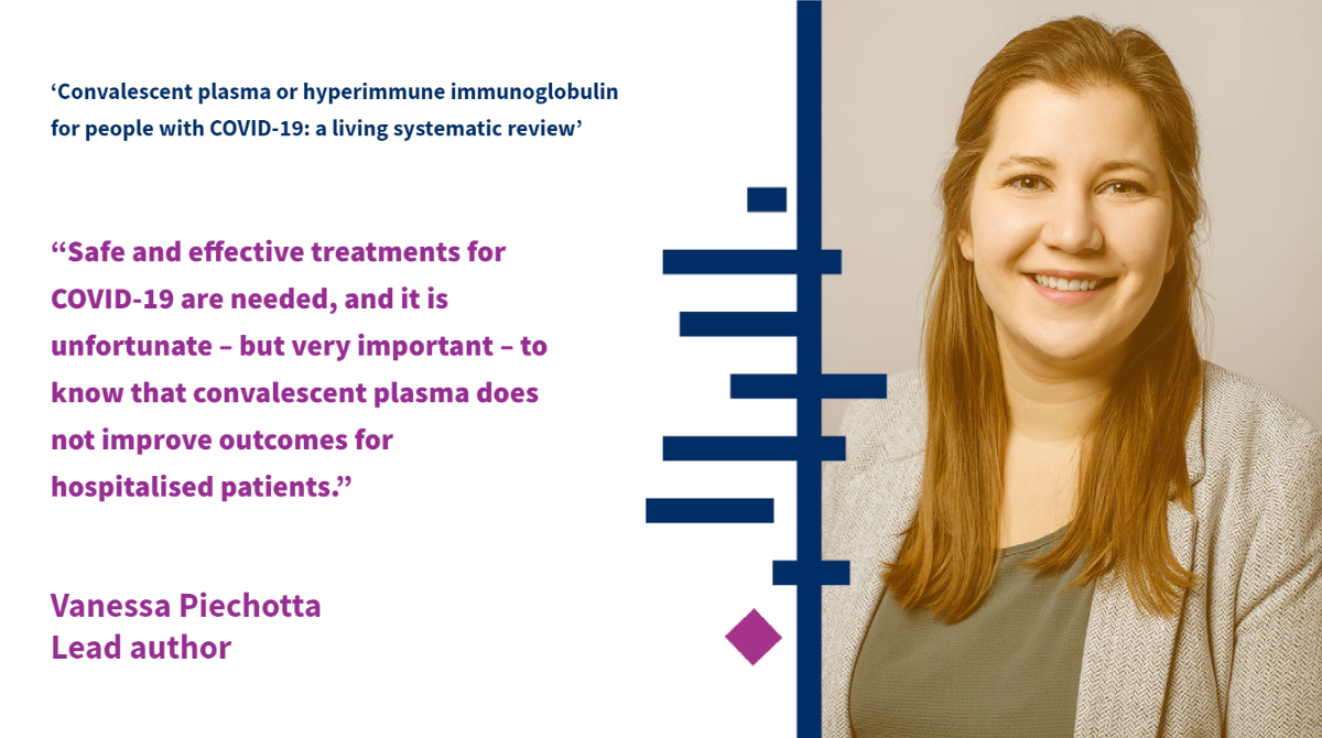 In less than a year, convalescent plasma, a treatment for COVID-19 patients, has been the subject of four Cochrane reviews. Updated as a living systematic review, the authors have gone from investigating this as an exciting and promising treatment to ‘closing the book’ on it and confirming it has no benefit as a lifesaving treatment for hospitalised patients. We speak to lead author Vanessa Piechotta, from University Hospital Cologne about the review and her experiences.