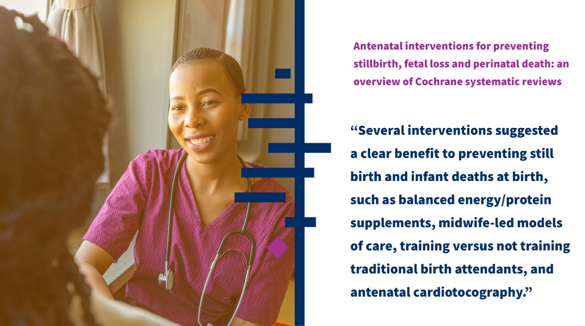 We found that from these 60 different interventions, most interventions were unable to demonstrate a clear effect in reducing stillbirth or perinatal death. However, several interventions suggested a clear benefit to preventing still birth and infant deaths at birth, such as balanced energy/protein supplements, midwifeled models of care, training versus not training traditional birth attendants, and antenatal cardiotocography. Possible benefits were also observed for insecticidetreated antimalarial nets and communitybased intervention packages, whereas a reduced number of antenatal care visits were shown to be harmful.