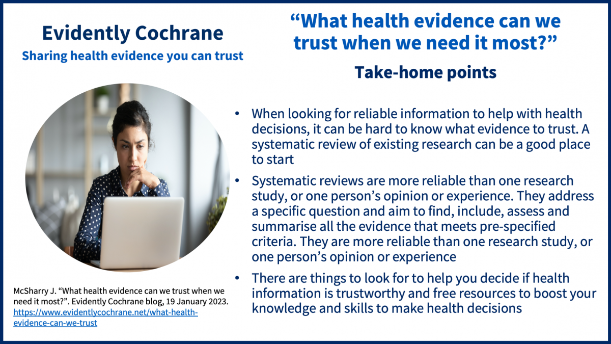 - Join in on the conversation on Twitter with @jenmcsharry @CochraneUK or leave a comment on the blog