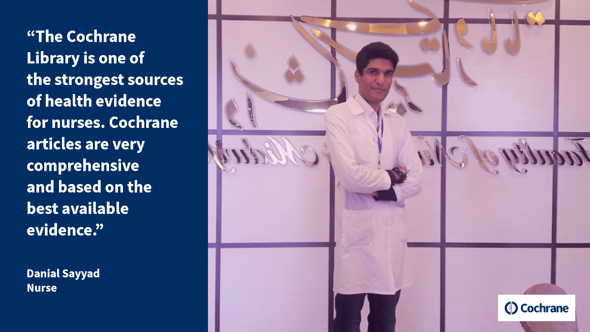 "I am a nurse with a bachelor's degree from Isfahan University of Medical Sciences. As you know, the nurse is one of the most important members of the care team and therefore has several responsibilities, such as training, advocating from the patient rights, and providing care and treatment interventions. A nurse encounters many patients each day; each with a history, clinical conditions, different culture, and a different level of education. Therefore, the nurse must have a great deal of knowledge and skills to manage all conditions, to meet the needs of all patients and other members of the treatment team. The nurse in addition to studying specialized books should be aware of articles and news related to his nursing field, in order to update and improve his knowledge. The Cochrane Library is one of the strongest sources of health evidence for nurses. Cochrane articles are very comprehensive and based on the best available evidence.