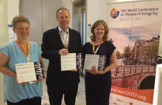 We are delighted to announce the awarding of the first Cochrane-REWARD prizes for reducing waste in research . This year’s winners were the Adding Value in Research programme of the UK National Institute for Health Research (NIHR), the Systematic Review Center for animal Experimentation (SYRCLE) in Nijmegen, Netherlands, and the Core Outcome Measures in Effectiveness Trials (COMET) Initiative coordinated in Liverpool, England. The ceremony took place during the 5th World Conference on Research Integrity in Amsterdam on 30 May 2017. The prize of GBP 2500 recognizes local or pilot initiatives that could lead to reductions in research waste. Given the high standard of the 18 applicants, the panel decided to award three prizes this year, with SYRCLE and COMET being awarded a joint second prize.